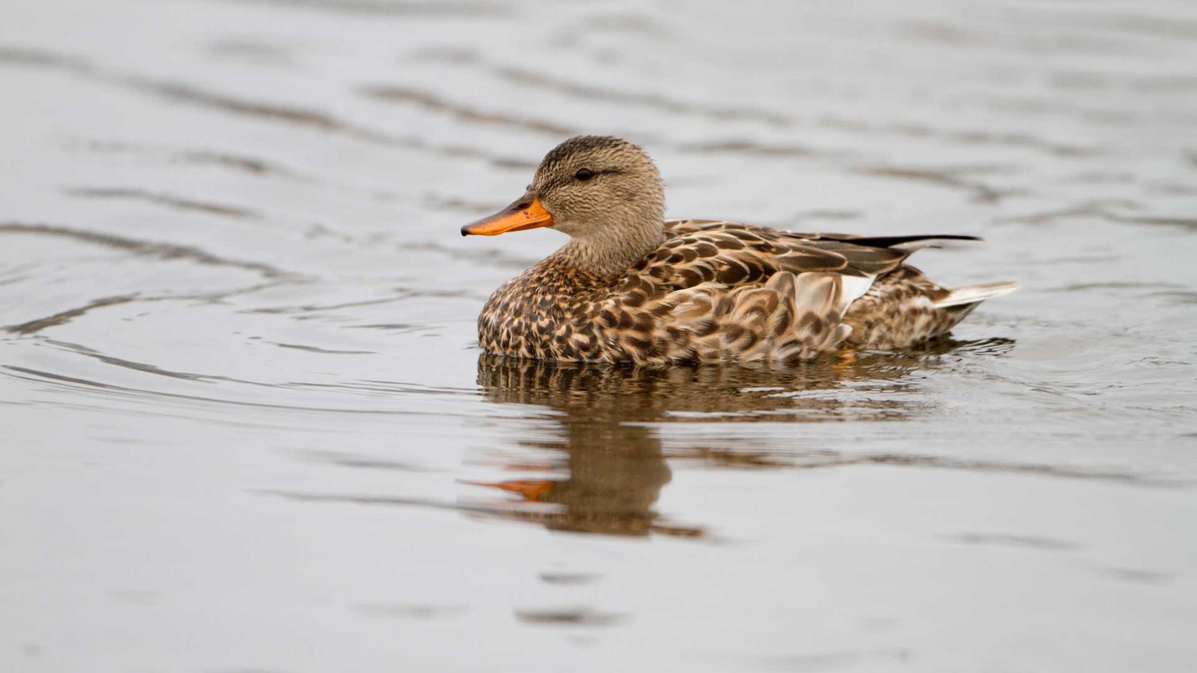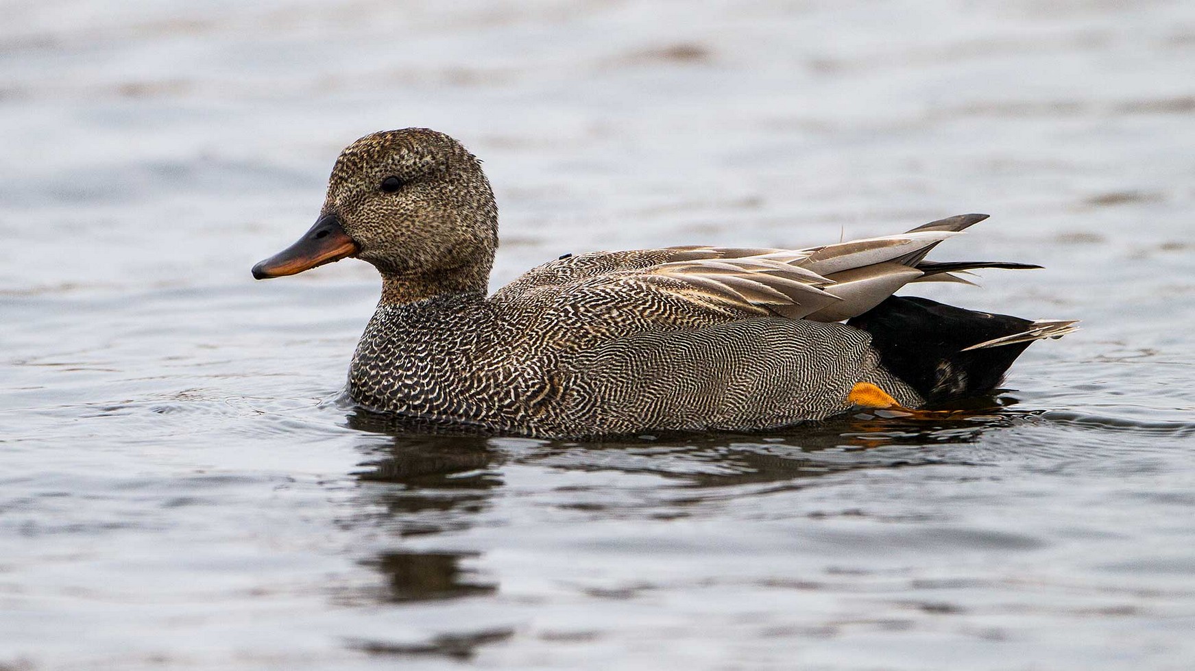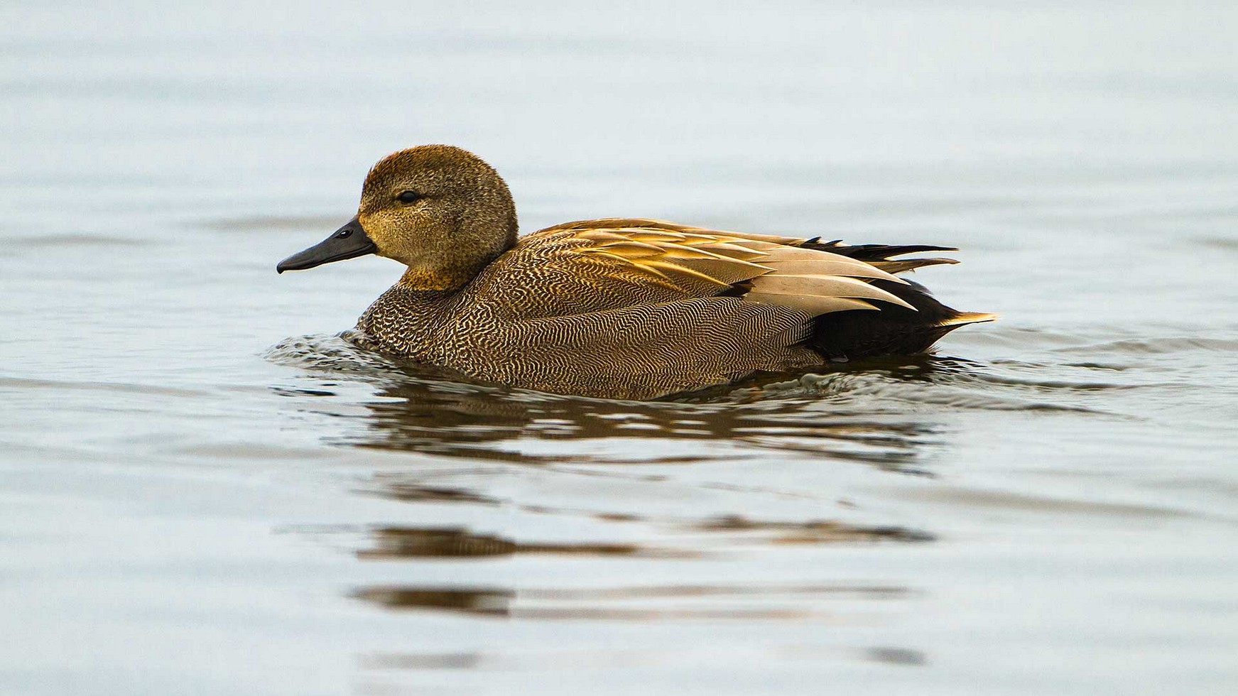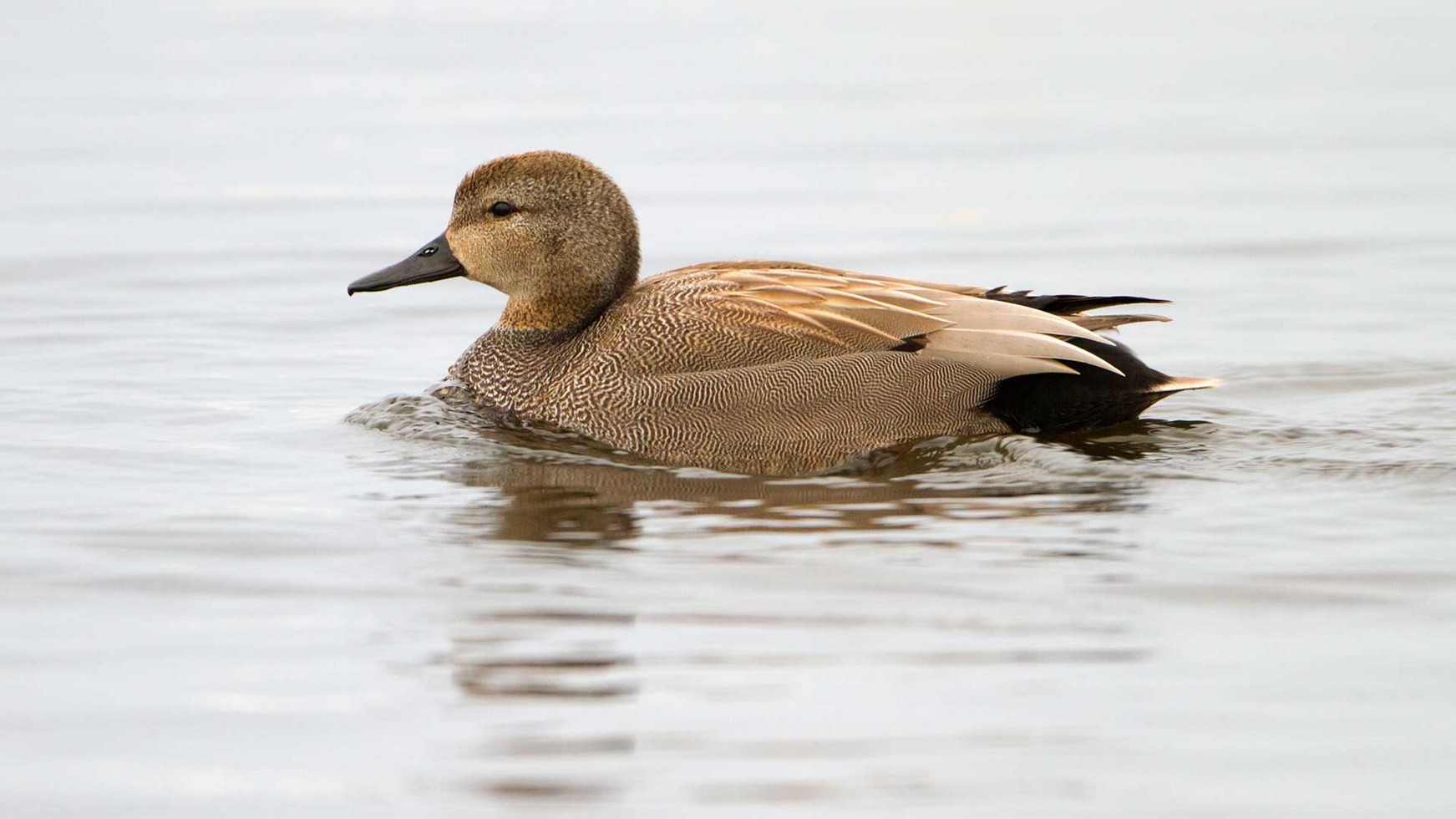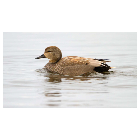 Die Männchen der Schnatterente sind auch in ihrem Prachtkleid unauffällig und gleichen aus der Entfernung den Weibchen anderer Eigentlicher Enten. Auffallend am Erpel ist lediglich das Schuppenmuster in zarten Grautönen, das aber nur aus der Nähe auffällt.